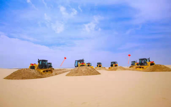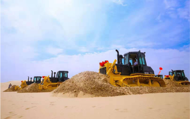 SD16D推土机,助力国家沙漠治理,光伏项目的建设,沙漠地区温度高,风沙粉尘大对推土机进气系统,冷却系统,驾驶室密封有严格的要求,SD16D推土机针对沙漠地区恶劣工况 蜜桃影视,定制化开发,由于超高的出勤率,超低的维护保养成本,赢得了用户的充分认可,为沙漠经济先导区的建设保驾护航。
